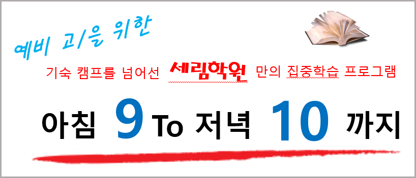 2021 겨울방학 집중학습 프로젝트 (Nine To Ten) 부모님께 어느 덧 한 해가 저물어가는 겨울의 문턱입니다. 부모님 가정에 평안이 가득하길 바랍니다. 저희 세림 학원에서는 이번 겨울 방학을 맞이하여 학생들을 위…